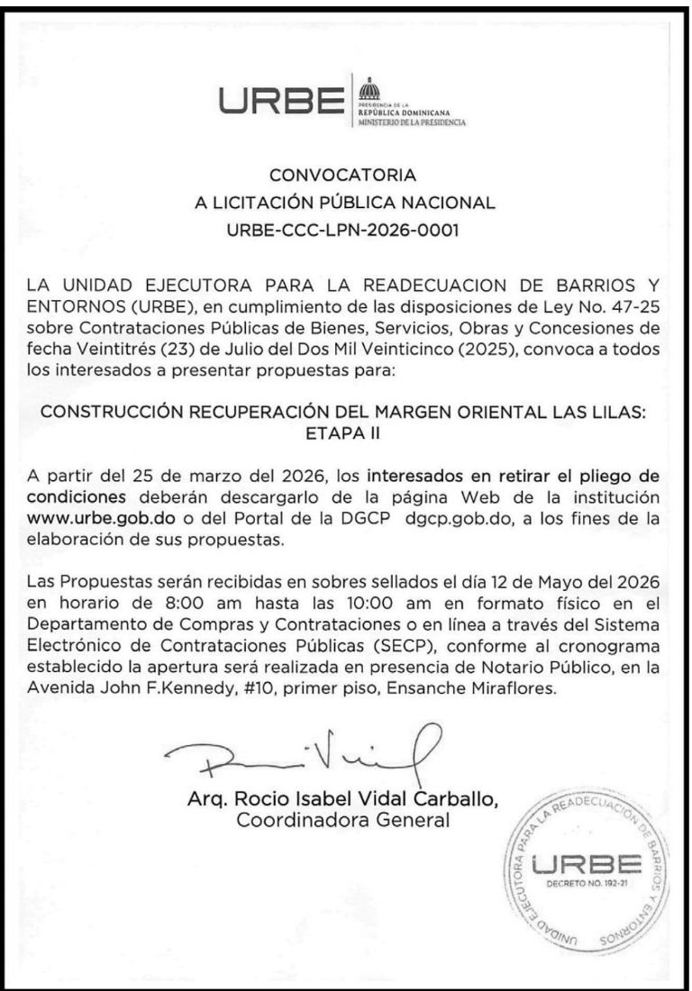 La Unidad para la Readecuación de Barrios y Entornos (URBE), adscrita al Ministerio de la Presidencia, anunció la licitación del inicio de la segunda etapa del Proyecto de Recuperación del Margen Oriental del río Ozama en el barrio Las Lilas, Santo Domingo Este.
