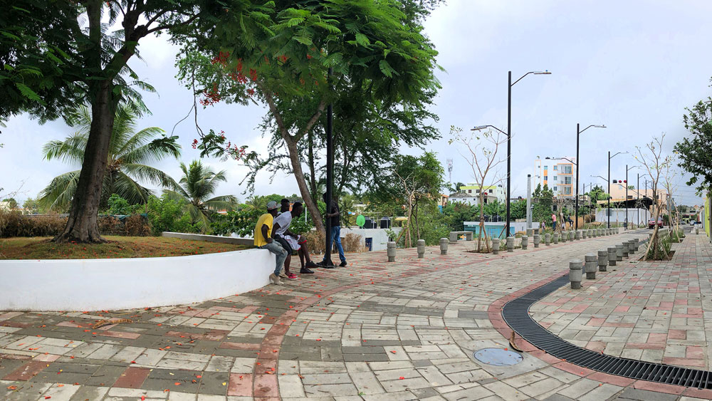 Además de los trabajos realizados en la calle, se construyó un paseo peatonal, acompañado de banquillos de hormigón y de una nueva área verde. Se readecuó la escalinata que conecta a otros vecindarios de la zona y se construyó el Multiusos Ramón Matías Mella, el cual cuenta con espacios para el uso de la comunidad.